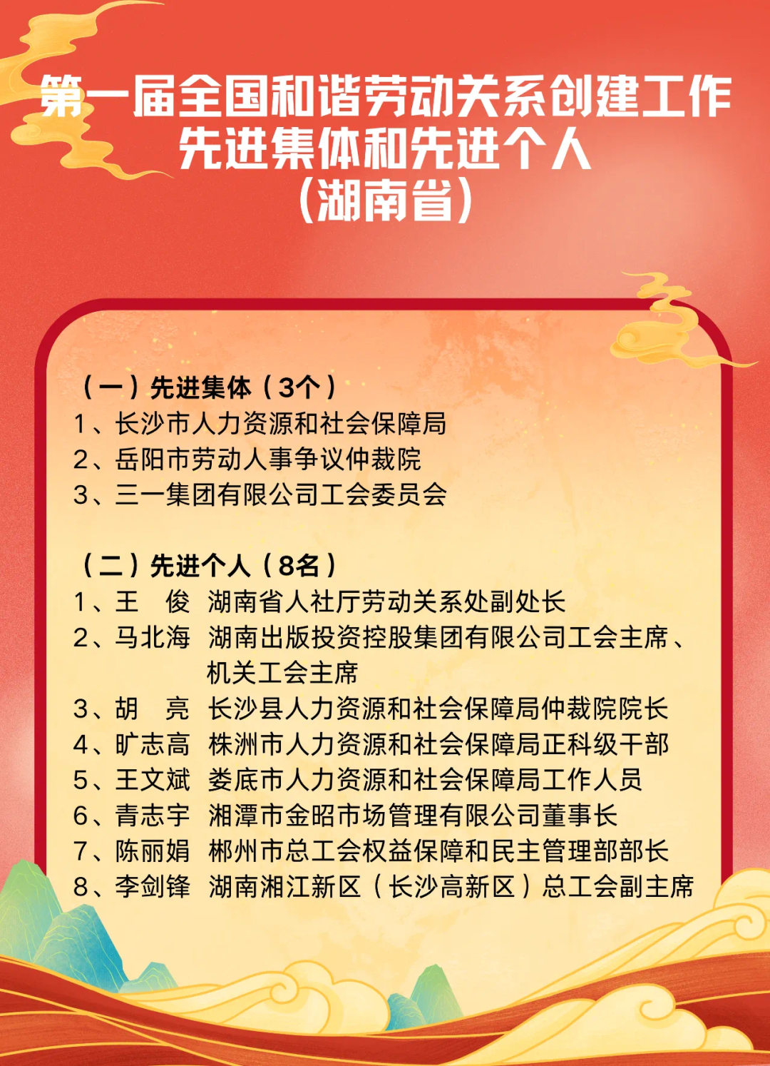 在3月19日召开的第一届全国和谐劳动关系创建工作先进集体和先进个人表彰暨经验交流会上,人力资源社会保障部、全国总工会、中国企业联合会/中国企业家协会、全国工商联表彰“全国和谐劳动关系创建工作先进集体”称号和“全国和谐劳动关系创建工作先进个人”称号。这是我国首次对和谐劳动关系创建工作先进集体和先进个人进行表彰。