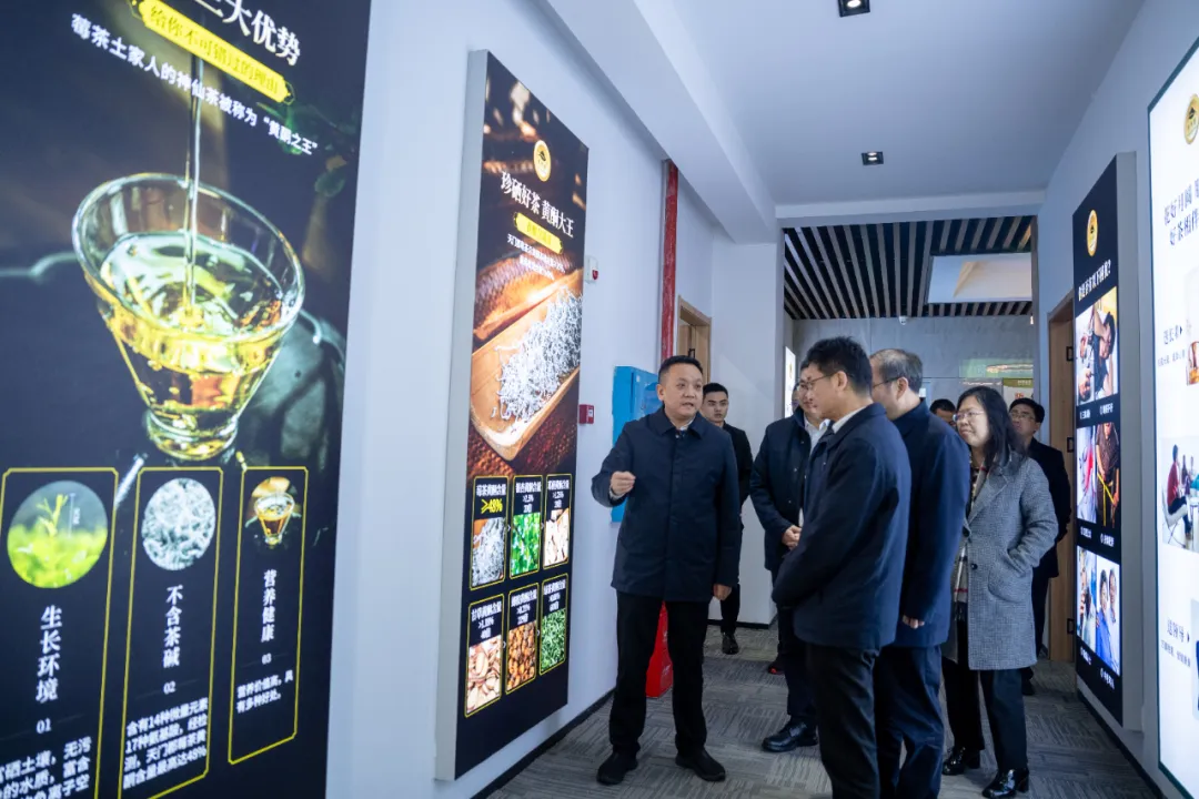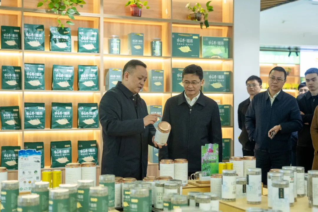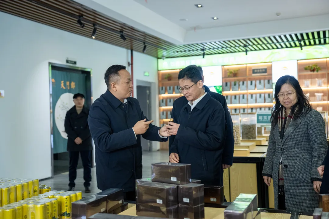 随后,调研组一行来到了乾坤生物的莓茶产品展示区,仔细考察了湖南乾坤生物科技有限公司旗下的天门郡系列莓茶产品,莓茶饮料、莓茶口服液、面膜、牙膏等深加工产品,以及天门郡1980茶旅融合产品。曹志强对企业的创新发展成果表示赞赏,认为乾坤生物在拓展莓茶产业链、提升产品附加值方面取得了显著成效,为莓茶产业的多元化发展建立示范样本,鼓励企业持续发挥龙头企业的引领作用,助力张家界莓茶产业高质量发展。