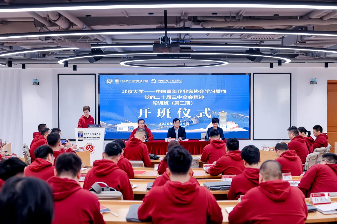 3月23日至26日,中国青年企业家协会学习贯彻党的二十届三中全会精神轮训班(第三期)暨全国青年企业家协会负责人轮训班在北京大学政府管理学院成功举办。北京大学纪委副书记、政府管理学院书记李海燕,中国青年企业家协会秘书长刘钢出席开班仪式并讲话,北京大学政府管理学院高端教育培训中心主任李延国主持开班式,来自全国各地的50余名青年企业家协会负责人和企业家代表参加活动。